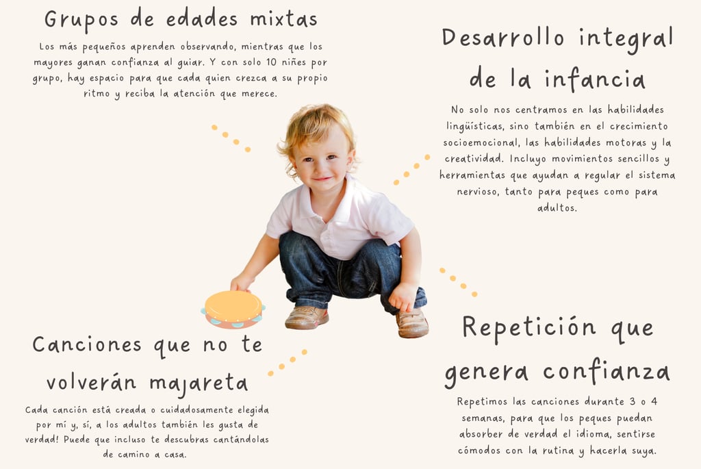 Son sesiones inclusivas que apoyan corazón, cuerpo y mente, con canciones que he creado y seleccionado con cuidado para que también resulten agradables a los adultos, un espacio para las grandes emociones y mucho lugar para crecer.